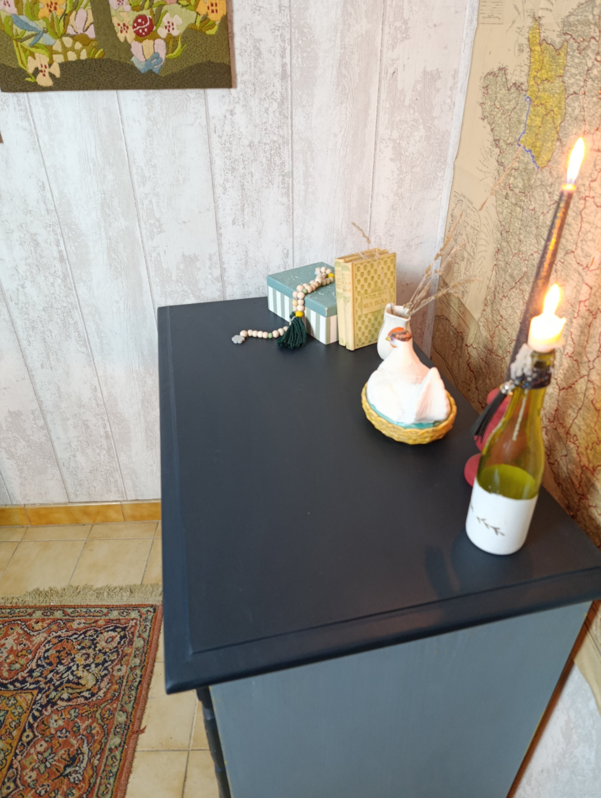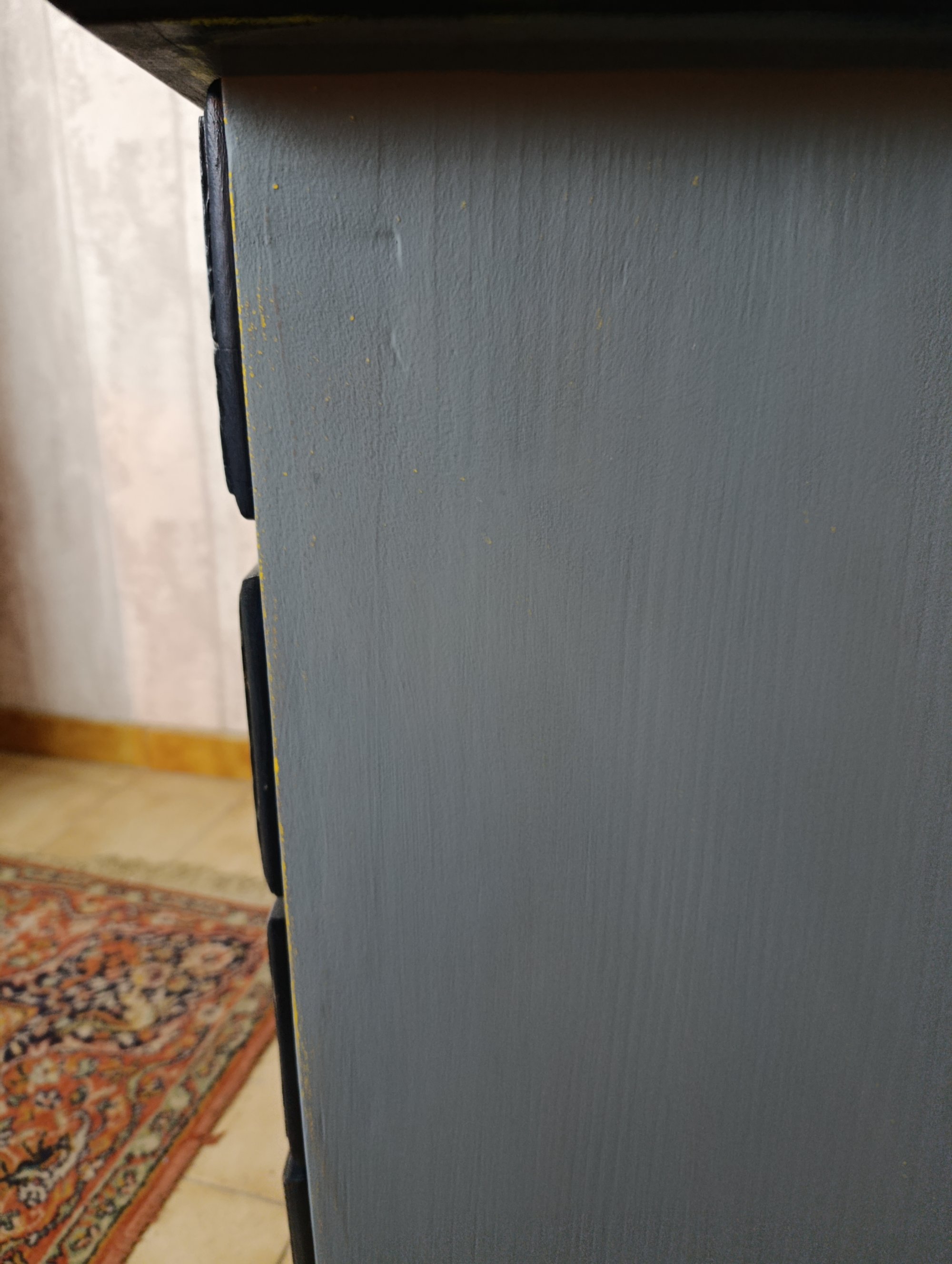 La commode est assez lourde car en bois massif et offre une belle capacité de rangement avec ses 5 tiroirs de différents formats.