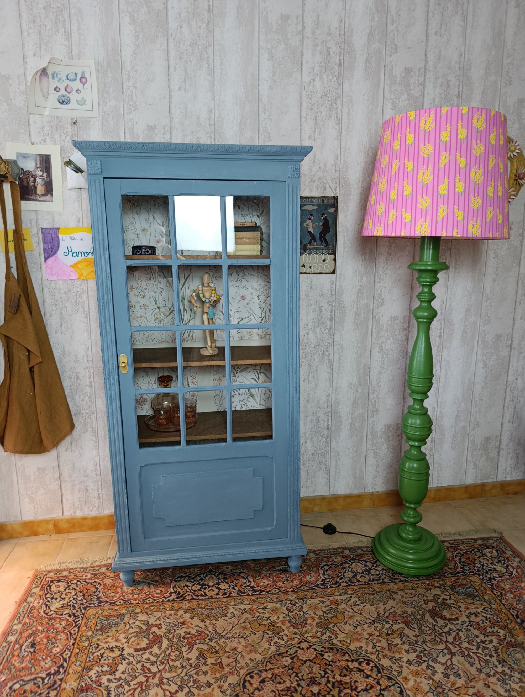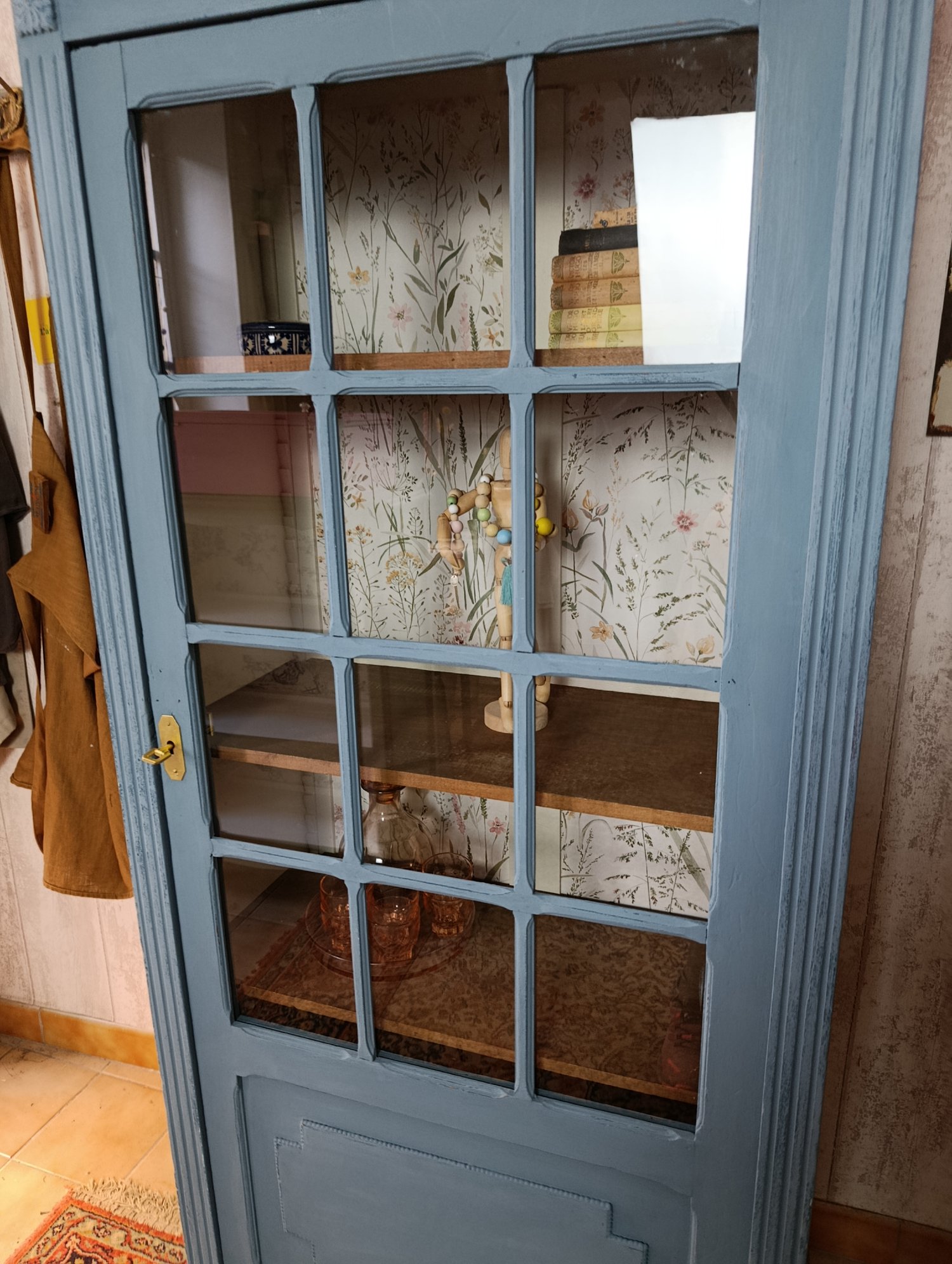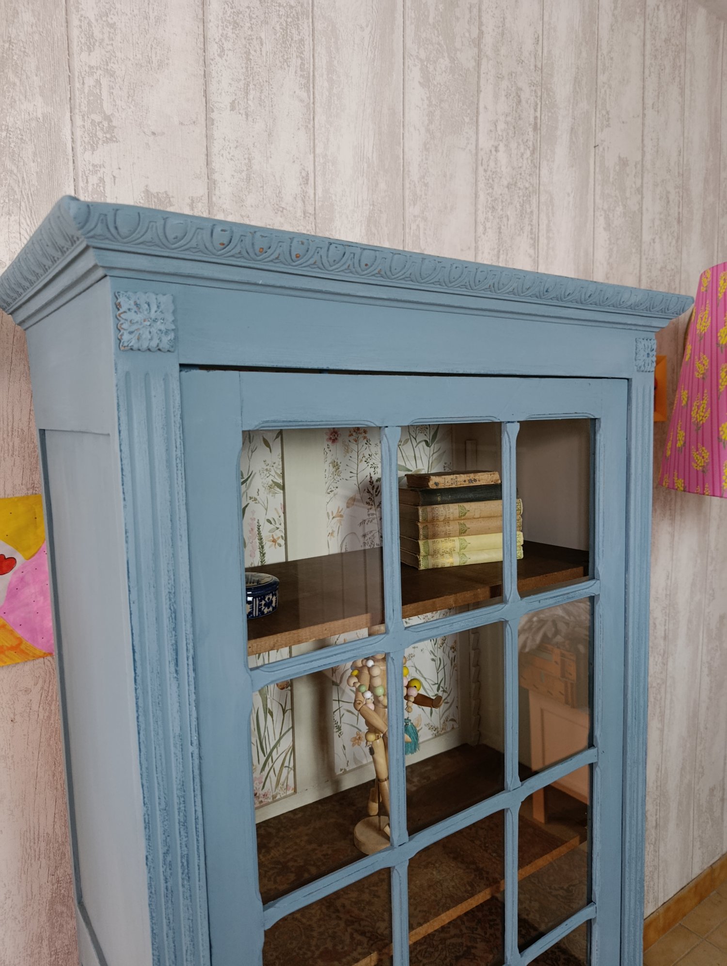 Une belle vitrine, petit format mais avec 4 étagères intérieures. Une porte vitrée pour exposer ses plus beaux livres, sa vaisselle ancienne ... L'extérieur est un bleu nordique patiné et l'intérieur un blanc chaud avec le fond tapissé d'un papier tout en fleurs.