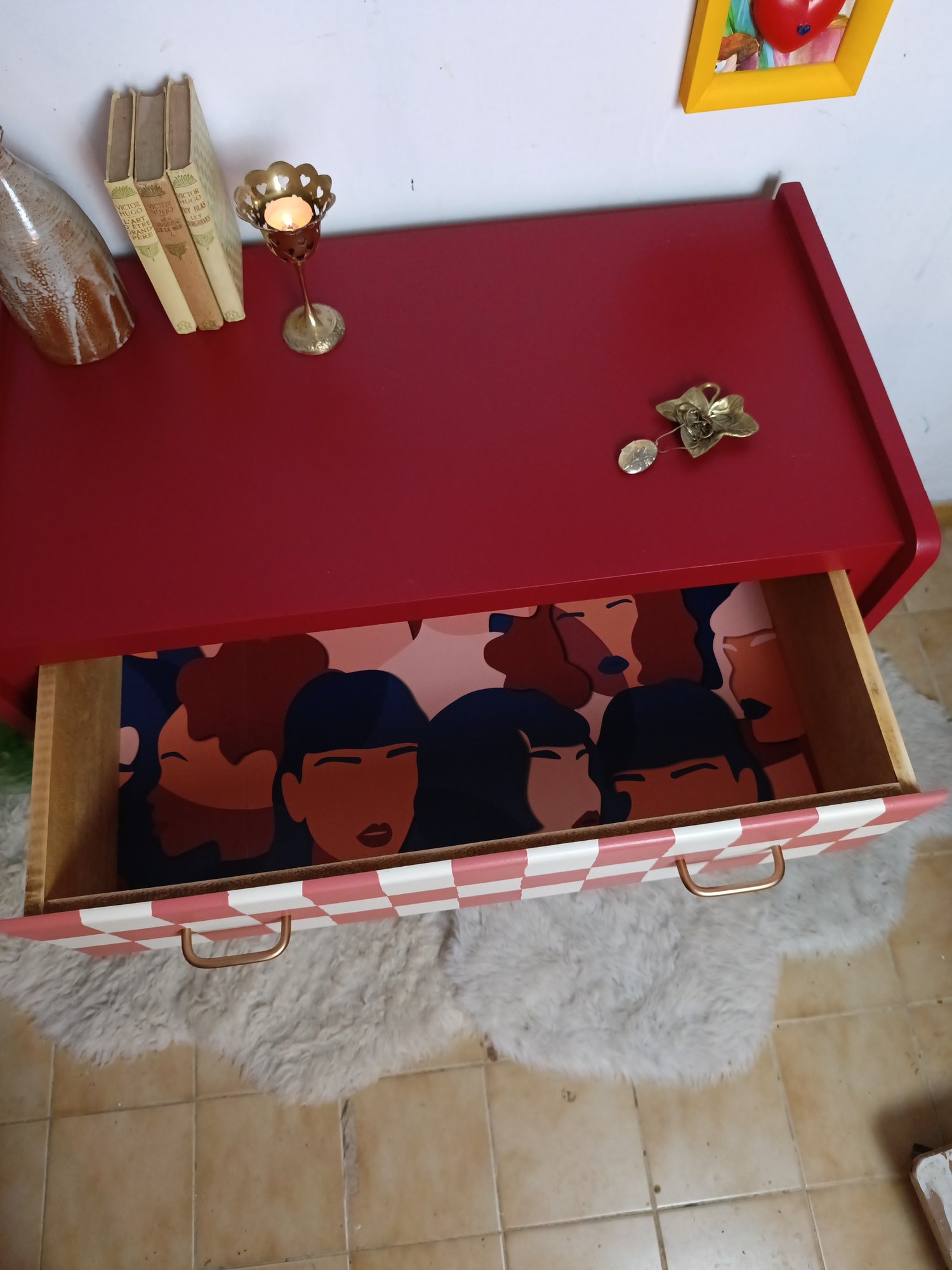 La belle commode années 50 avec ses jolies formes et surtout les pieds compas qu'on adore ! En version colorée aux couleurs chaudes et au motif Vichy sur ses tiroirs. Ses poignées sont d'origine après un rafraîchissement. Les fonds de tiroirs ont été tapissés d'un papier peint vinyle aux profils féminins. Le tout a été protégé par un vernis mat pour une utilisation sans souci !