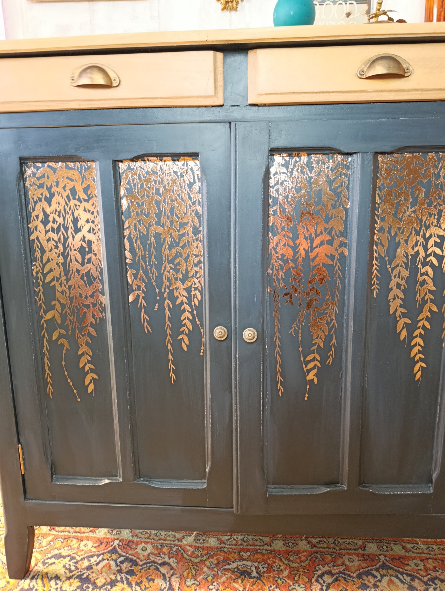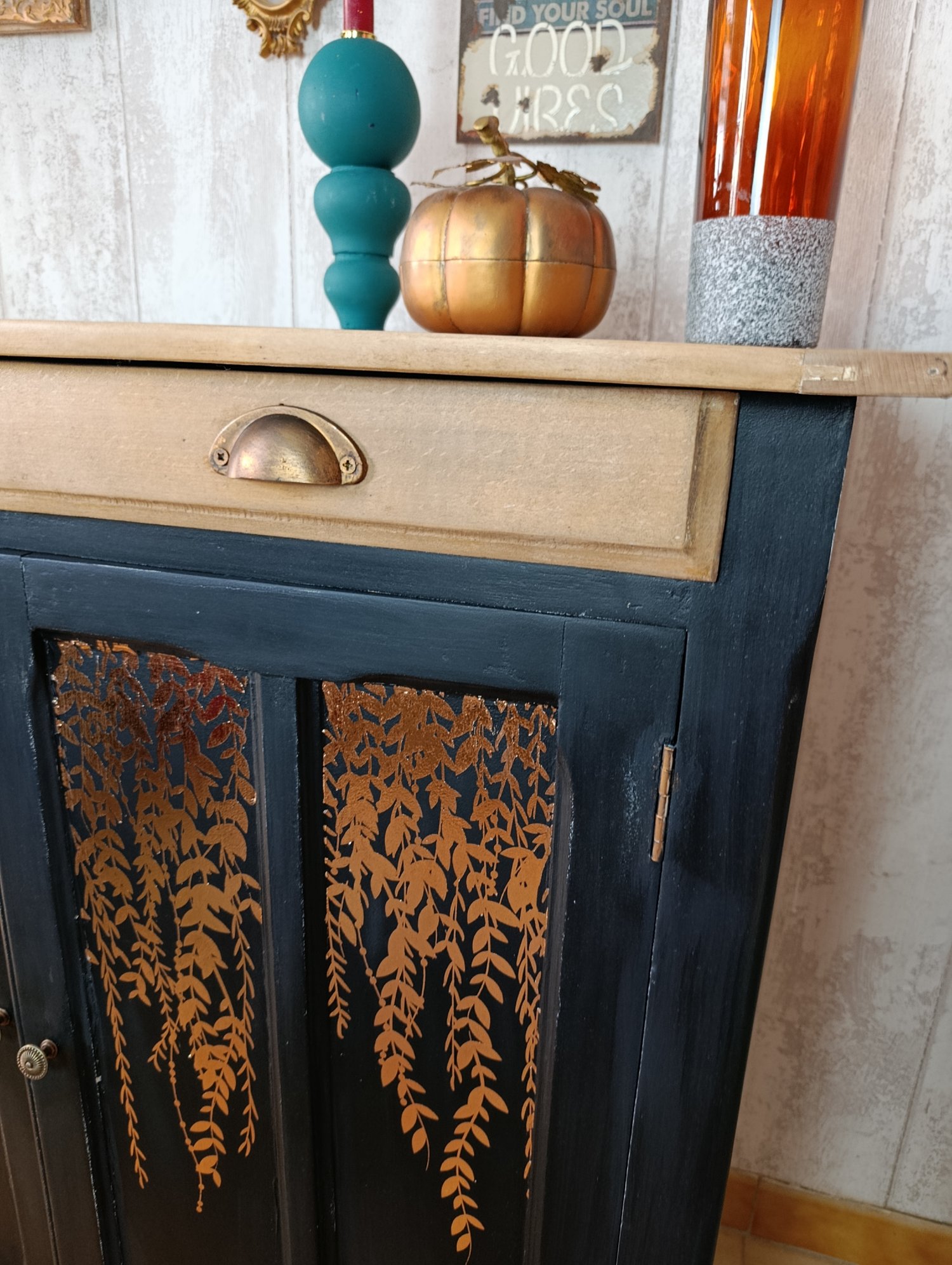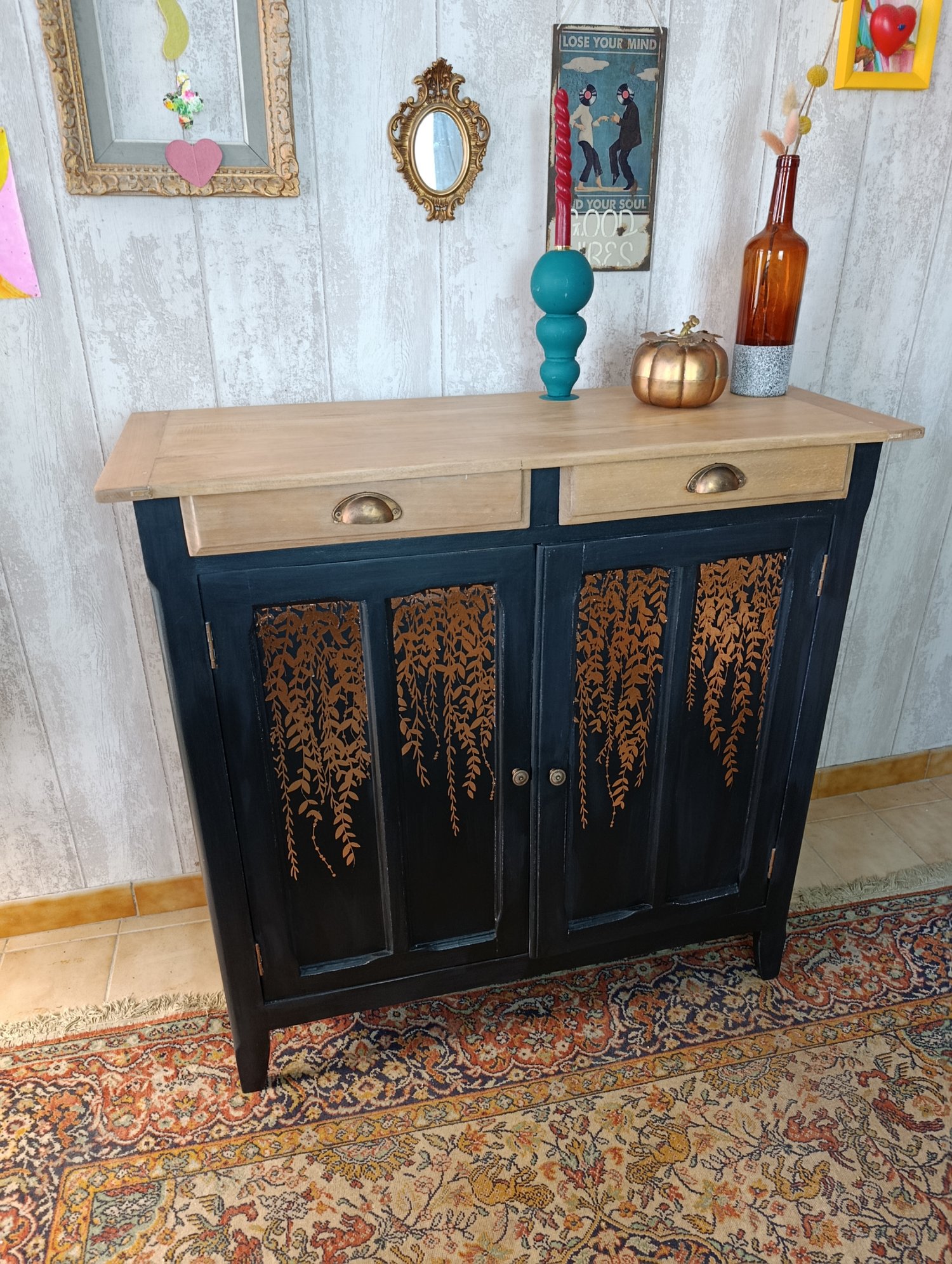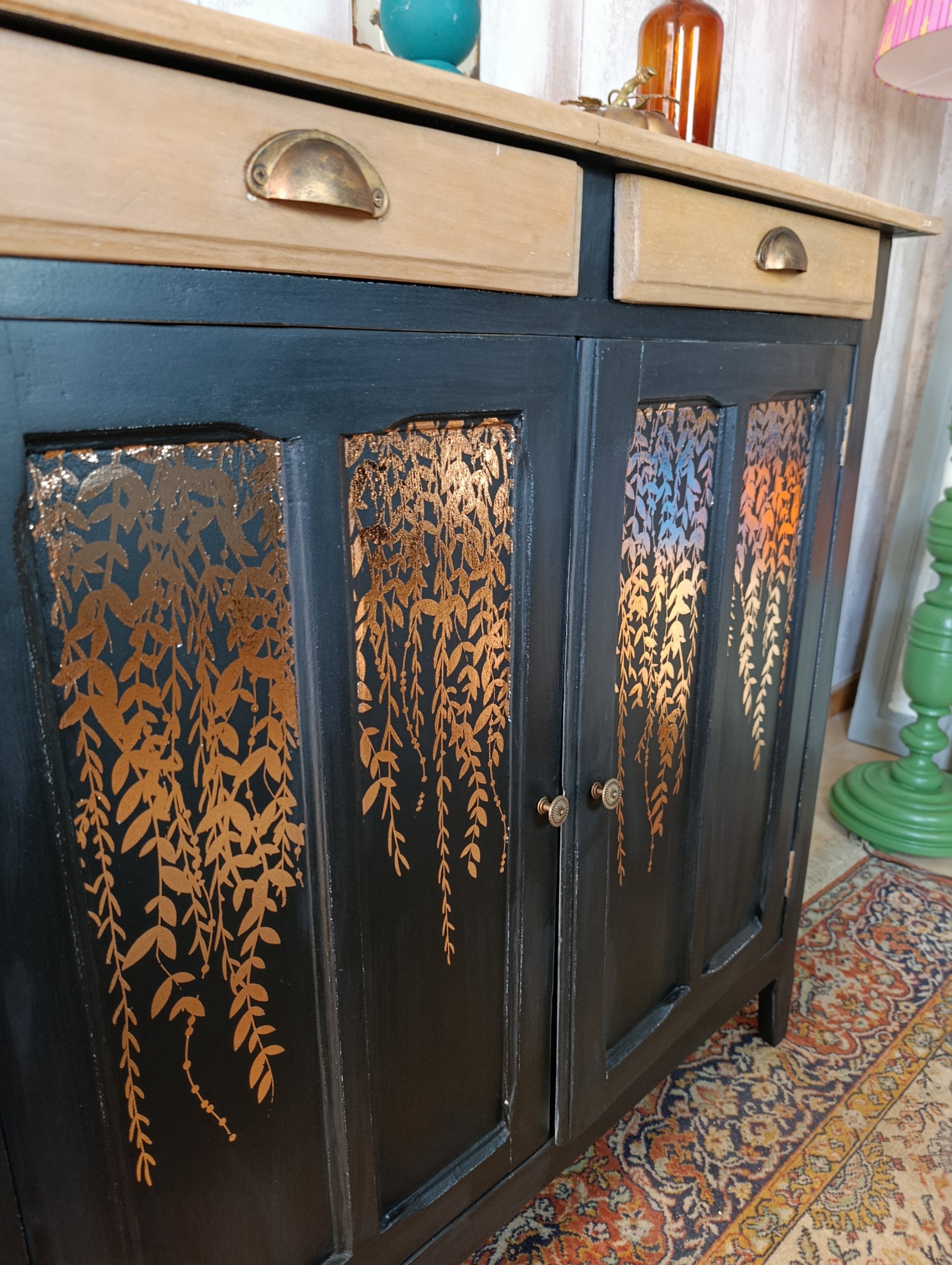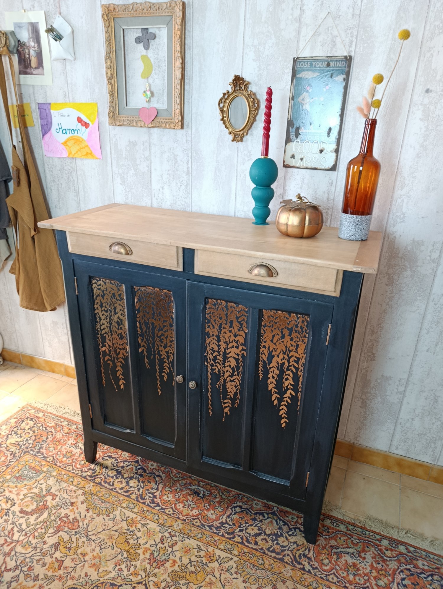 Un buffet parisien totalement unique avec un motif végétal cuivré sur les portes, une patine noire esprit indus'/vieilli, son bois a été mis en valeur et teinté sur les faces des tiroirs et le plateau.
